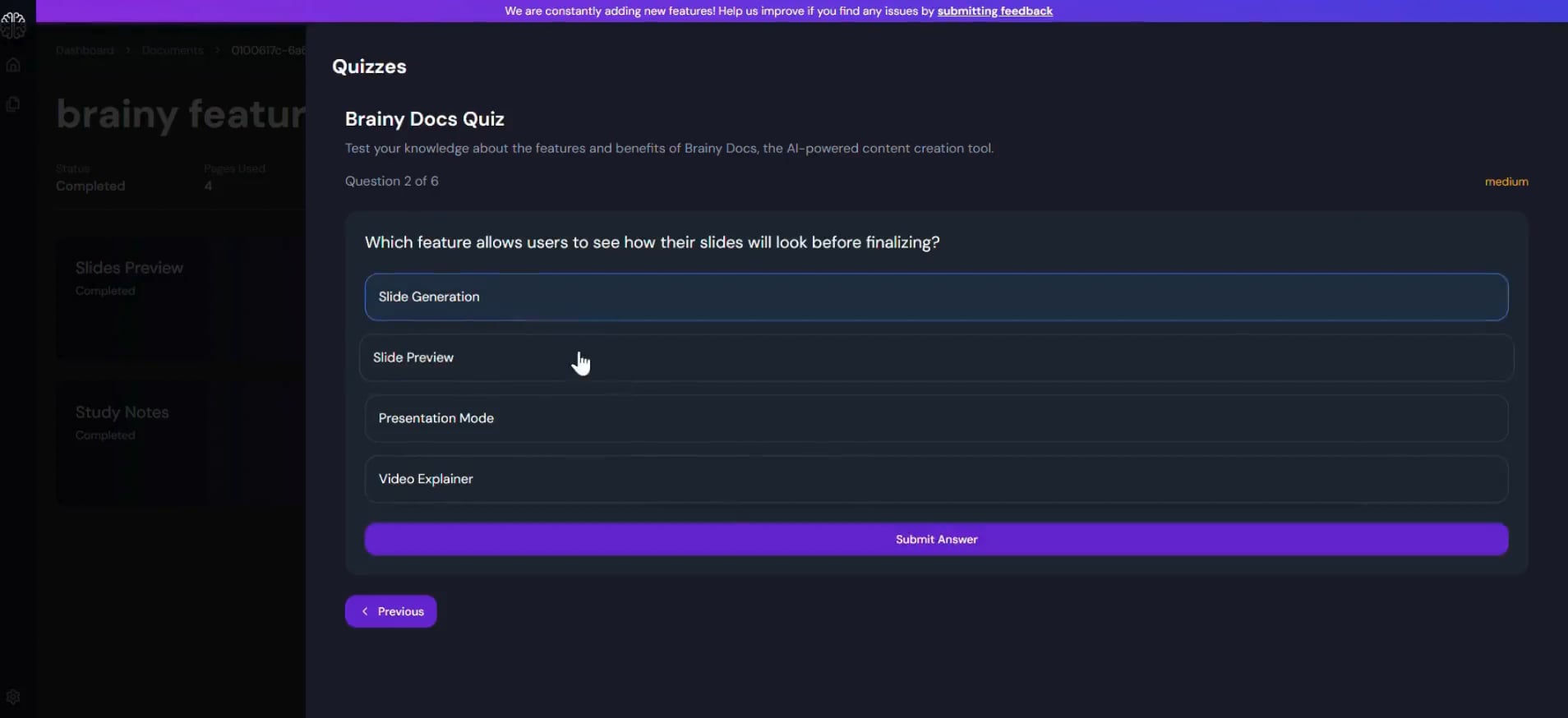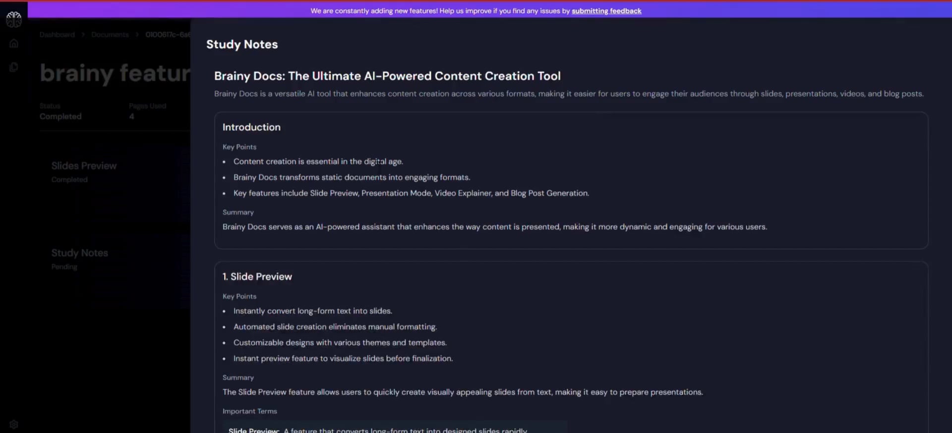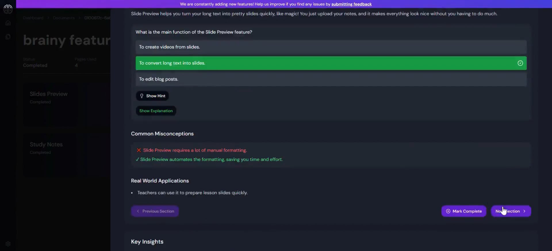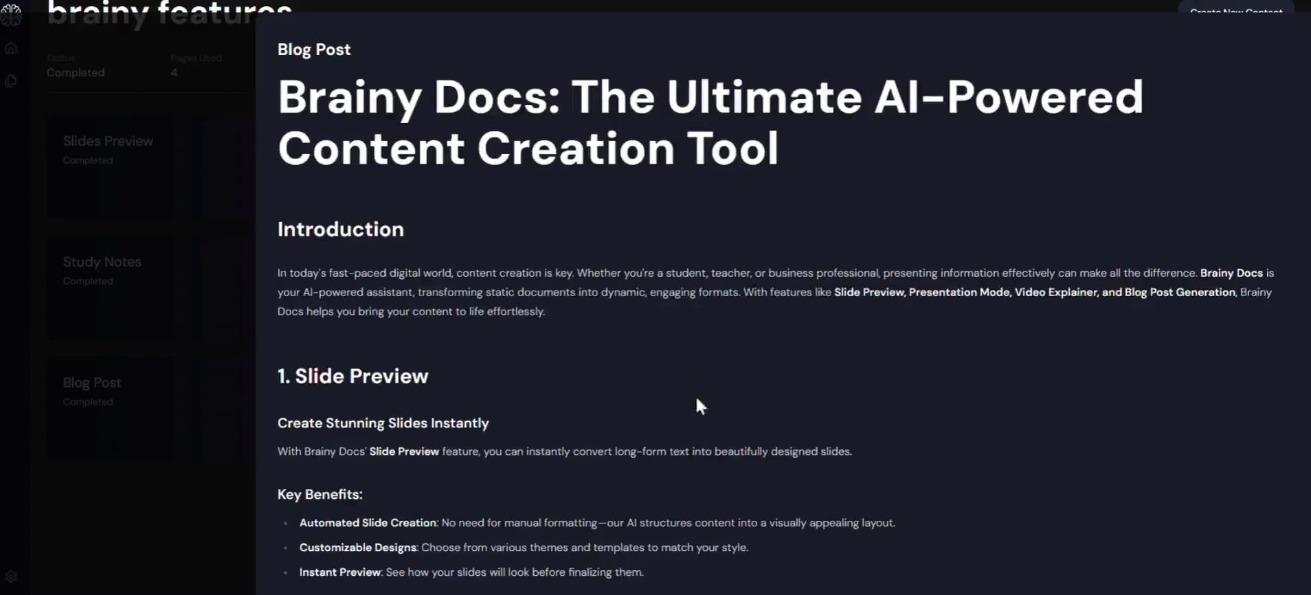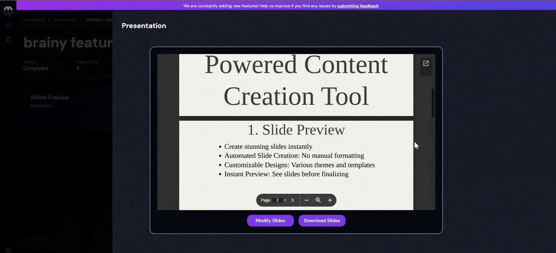 This feature allows users to preview their content as slides before finalizing. It helps in ensuring the layout and information flow are perfect for presentations.